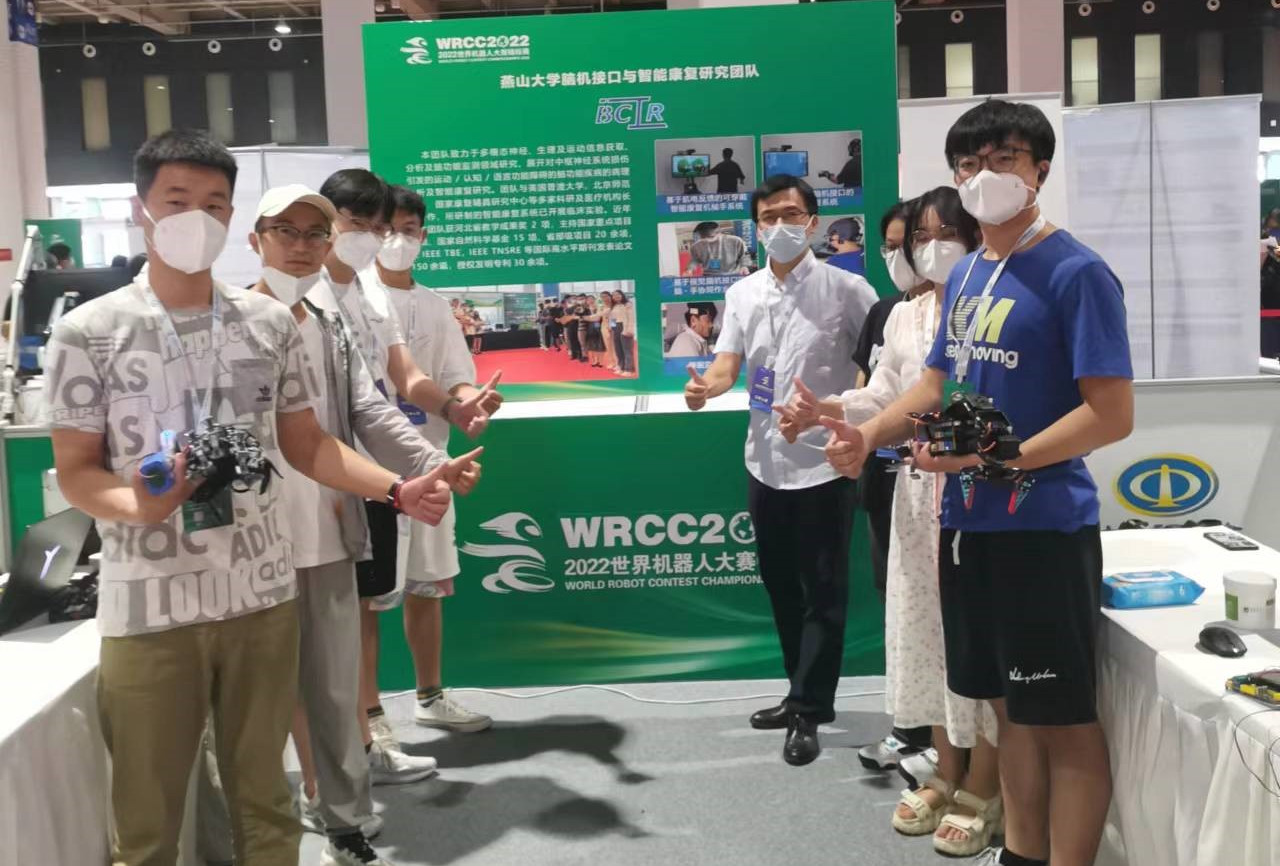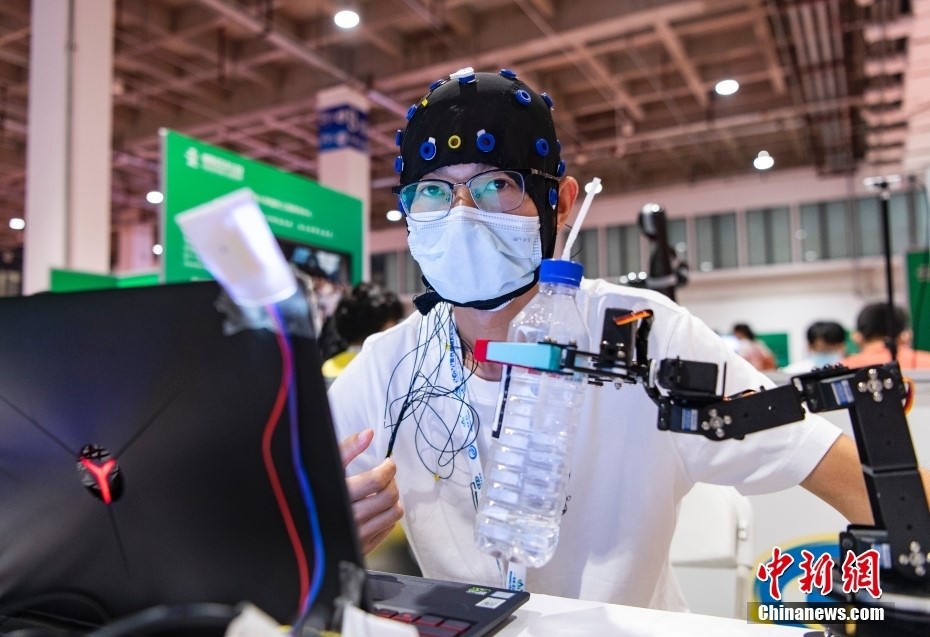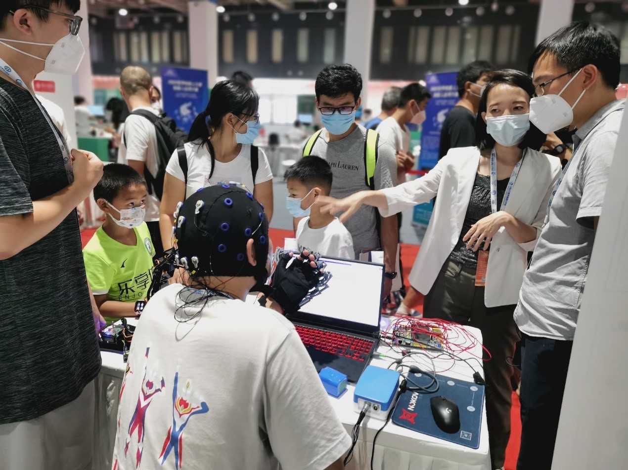在近日举办的2022世界机器人大会上,乌鸦传媒脑机接口与智能康复研究团队作为脑机接口大赛技术赛的组织团队,同时受邀进行了脑机融合智能康复手和基于混合BCI的肢体康复训练系统的现场展示,吸引了众多现场观众的关注,我院教师赵靖接受了记者采访并被中央电视台央视新闻1+1等多家媒体报道。在脑机融合智能机械手展示中,操作者通过大脑思维直接控制机械手,完成了抓取水瓶和接听手机的任务,有望增强人的脑手协同操作能力。在混合脑机接口的肢体康复训练系统的展示中,操作者通过混合脑机接口和虚拟康复技术,实现了对每个手指的康复运动,可应用于脑卒中患者肢体运动康复。