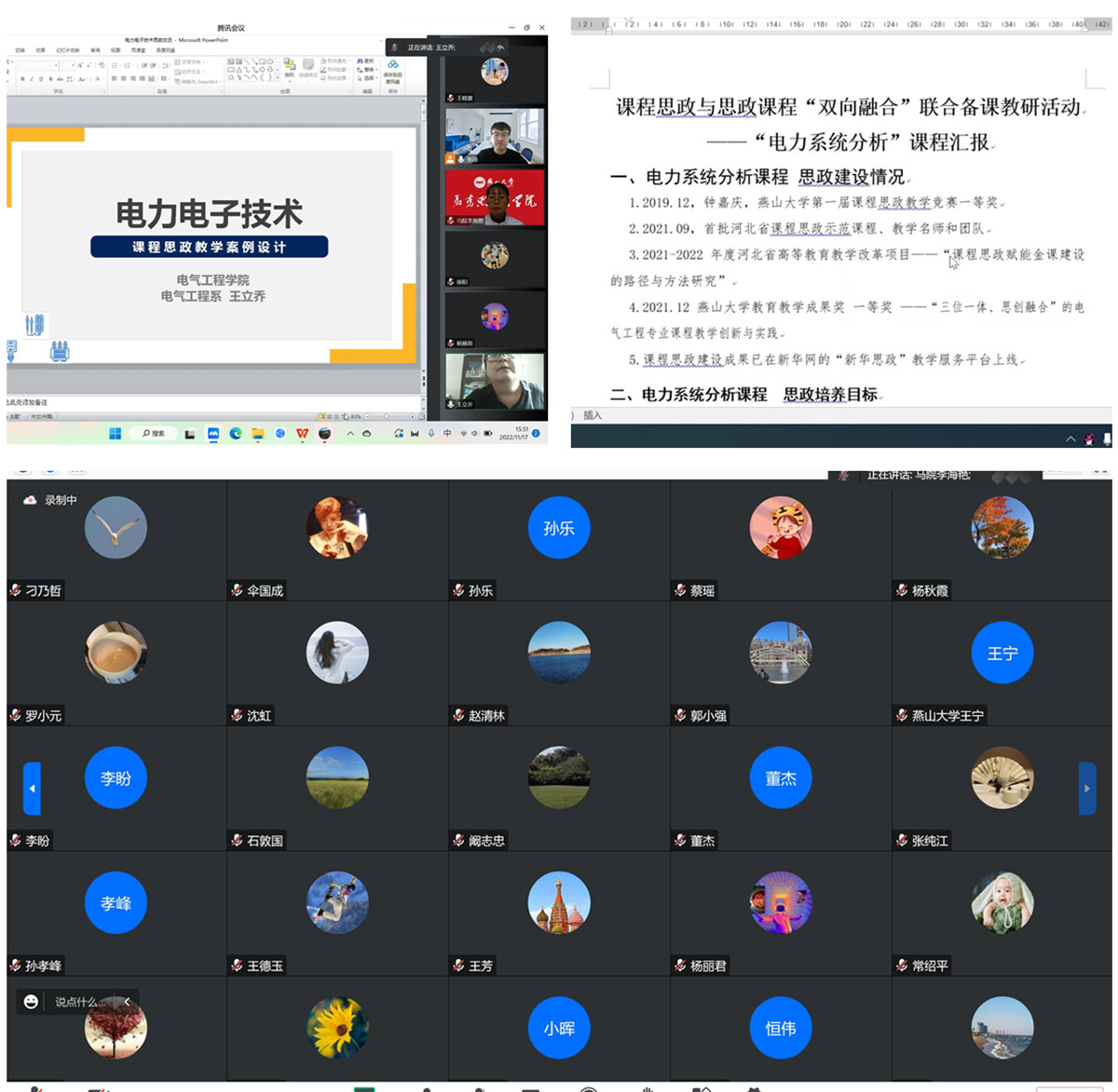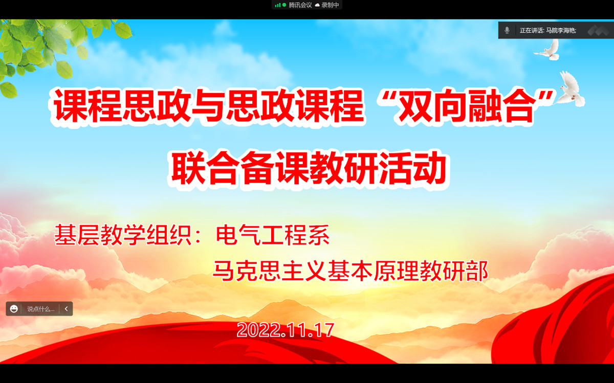 为深入落实教育部《高等学校课程思政建设指导纲要》要求,持续深入推进学校课程思政建设,提升课程思政建设工作的精准性、融合性和有效性。11月17日下午15:30,电气工程系联合马克思主义基本原理教研部开展“课程思政与思政课程‘双向融合’联合备课教研活动”。本次活动在线上通过腾讯会议进行,电气工程学院副院长郭小强、马克思主义基本原理教研部李海艳等7名教师以及电气工程系全体教师参加了此次联合备课活动。活动由电气工程系副主任张迪主持。