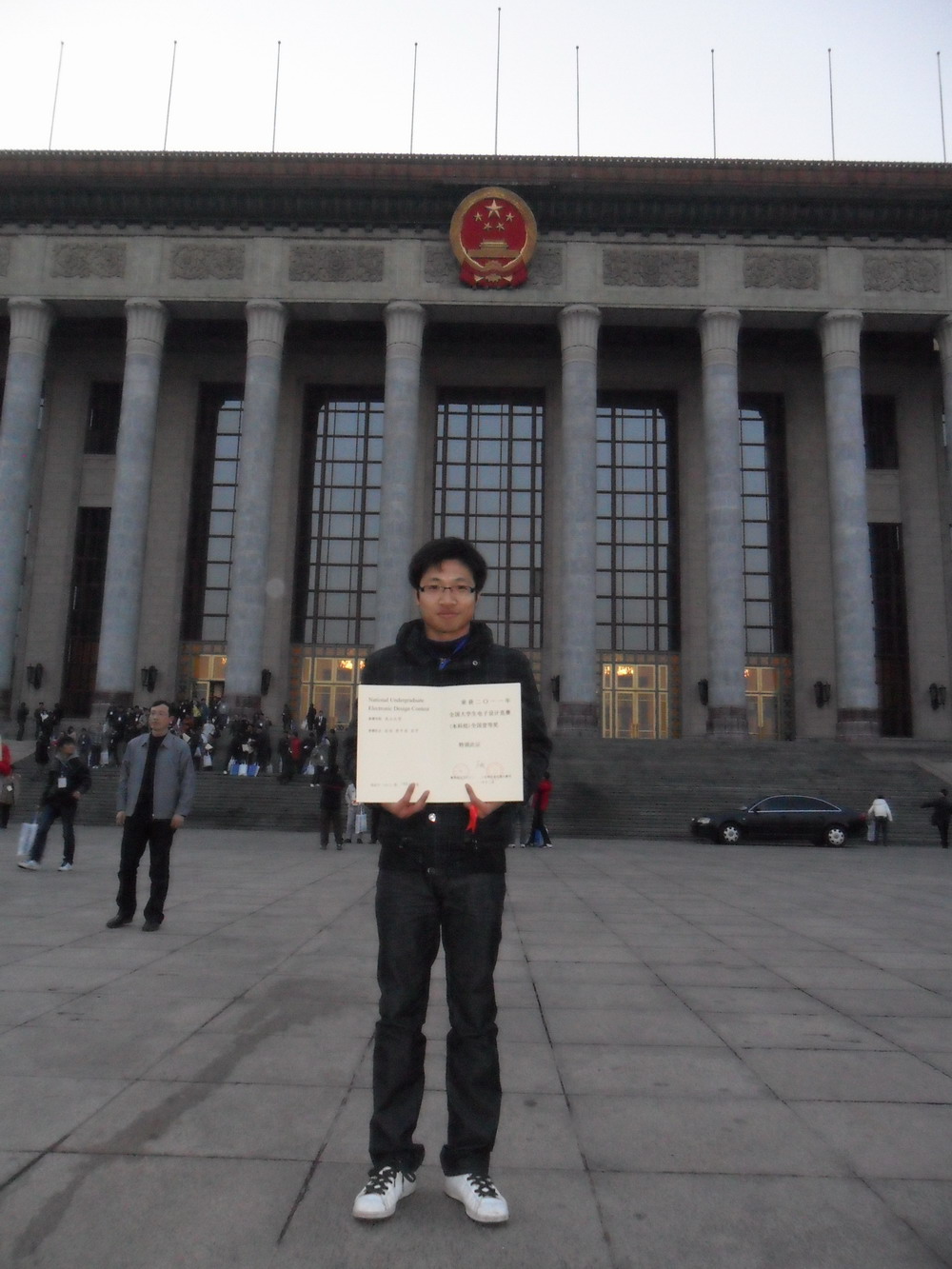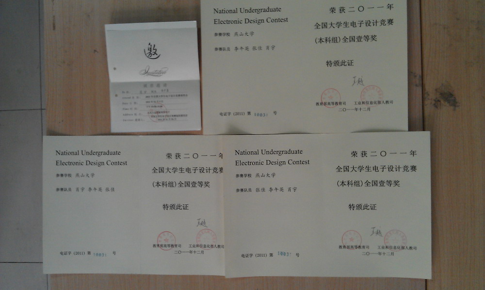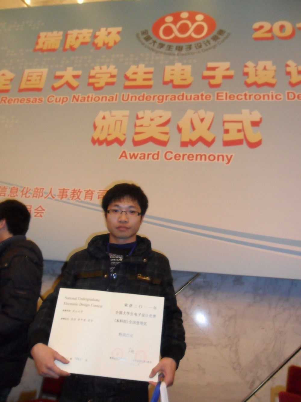 12月3日下午,由教育部和工信部主办的“瑞萨杯”2011全国大学生电子设计竞赛颁奖典礼在北京人民大会堂新闻报告厅举行。我校电气工程学院2009级本科生张佳、肖宇和李午英设计的作品“智能小车”获得全国一等奖。学生代表张佳在教务处副处长李仕华的带领下参加了颁奖仪式。